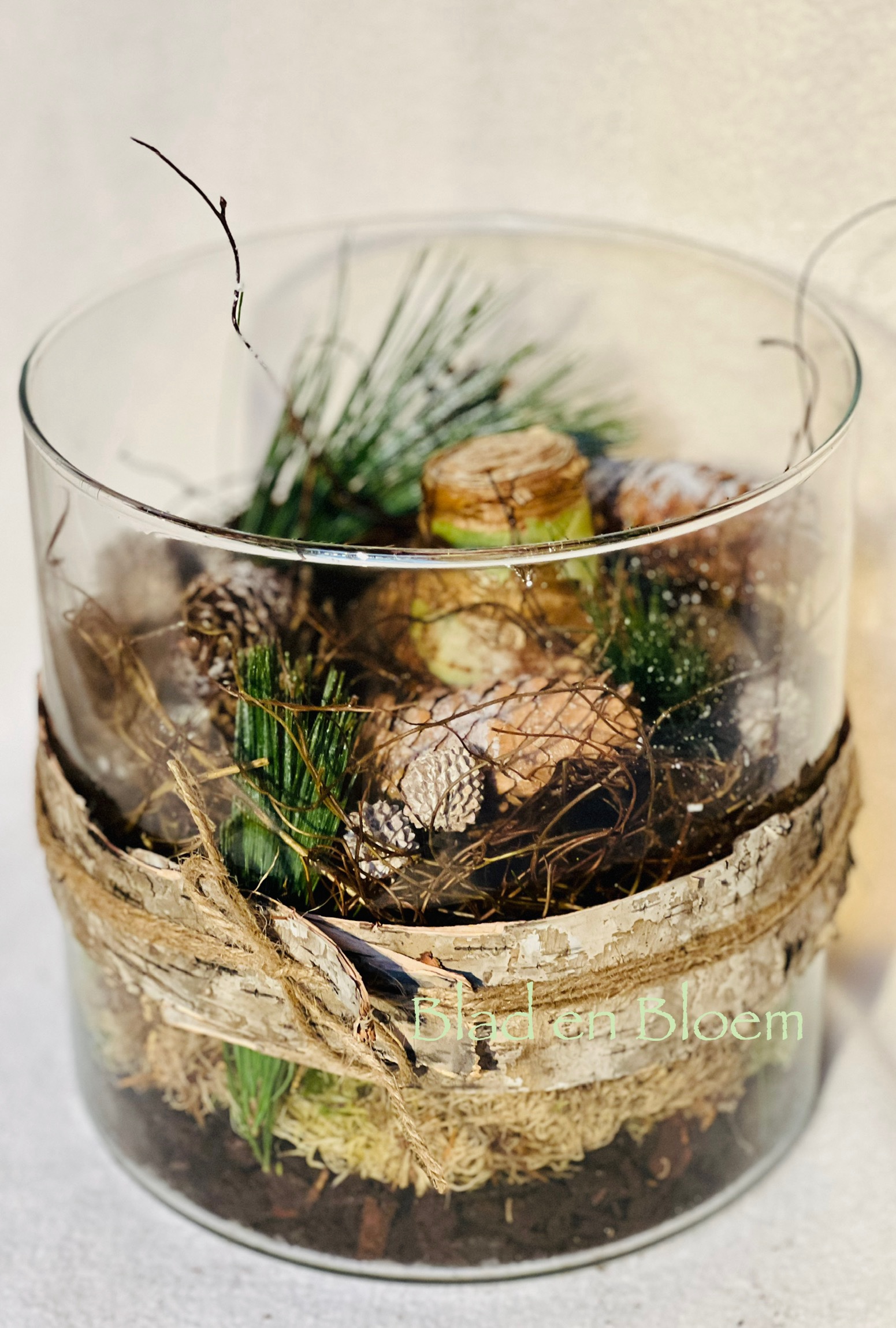 Een gezellige glazen pot hoog met een mooi aangeklede amaryllis met o.a. mos en dennenappels.