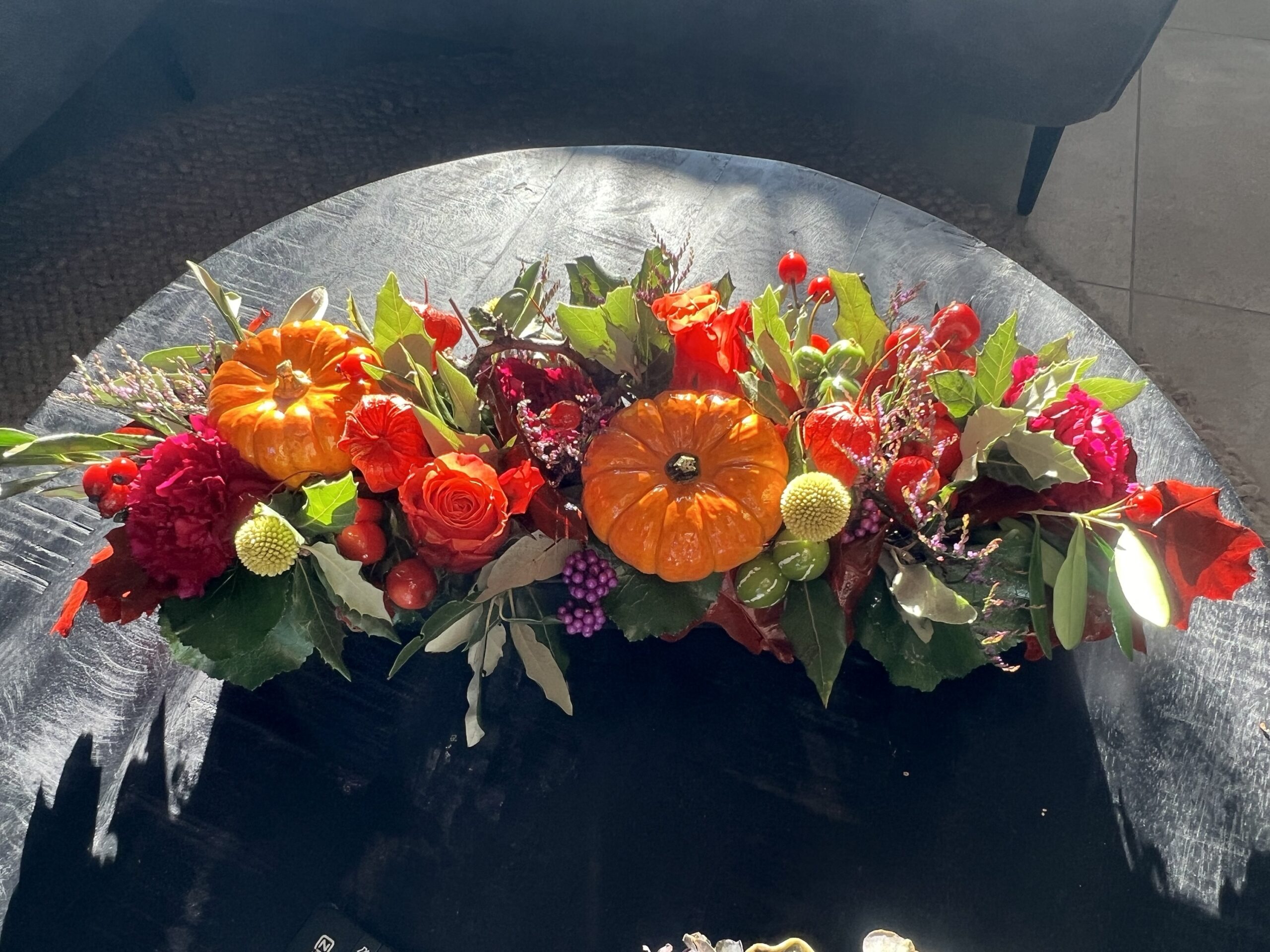 Een mooi laag bloemstuk gemaakt op een schaal, vaas, plateau (bord), boomstronk, et cetera en/of met verschillende producten en bloemen van het seizoen erin verwerkt.
