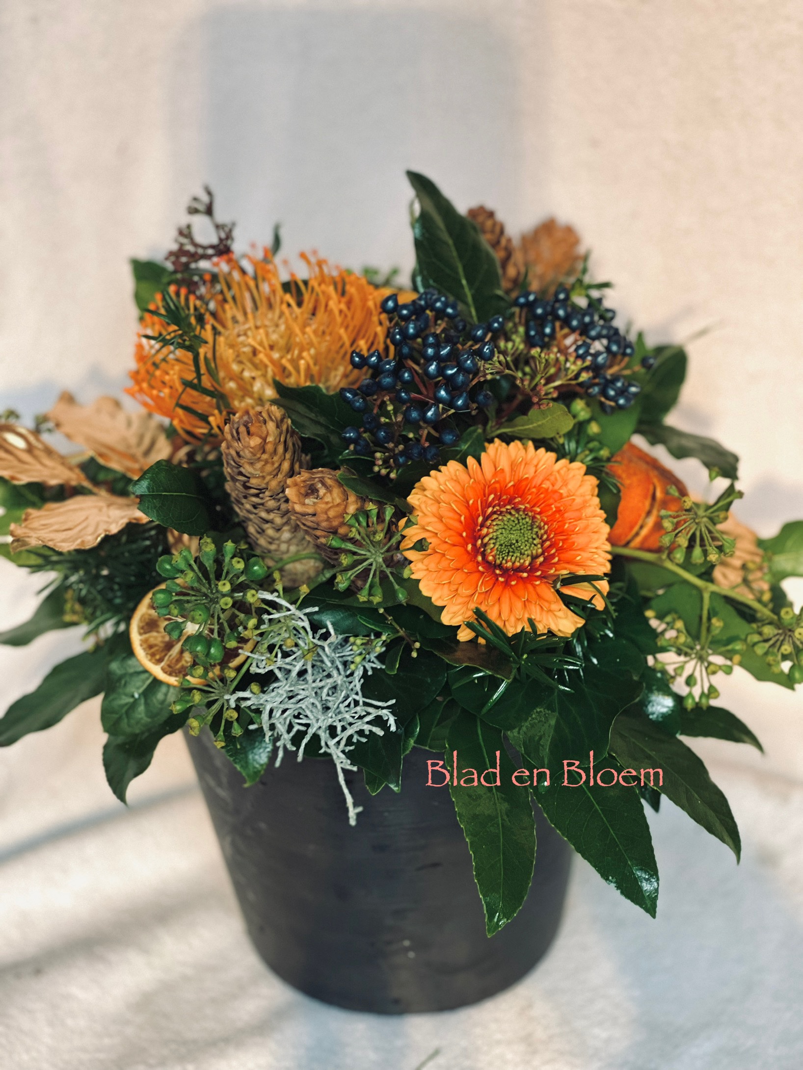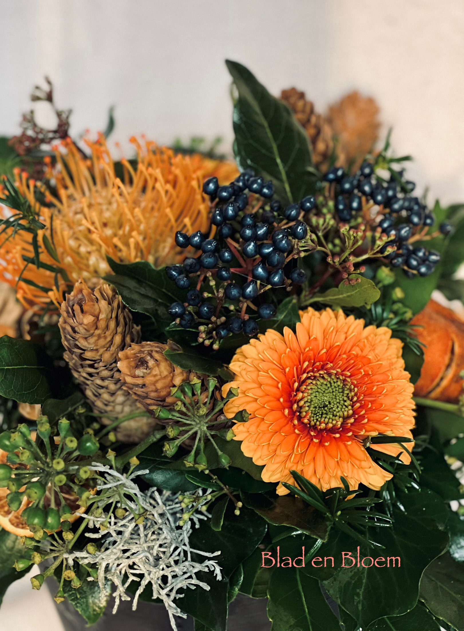Ieder stuk is uniek, met een persoonlijke touch is elk bloemstuk dat wij maken anders. Daarom zullen de foto’s die u ziet misschien niet overeenkomen met uw bestelling en dienen deze enkel als voorbeelden. Ter vergelijking: het stuk dat op de productfoto staat afgebeeld kost in totaal €35,-.