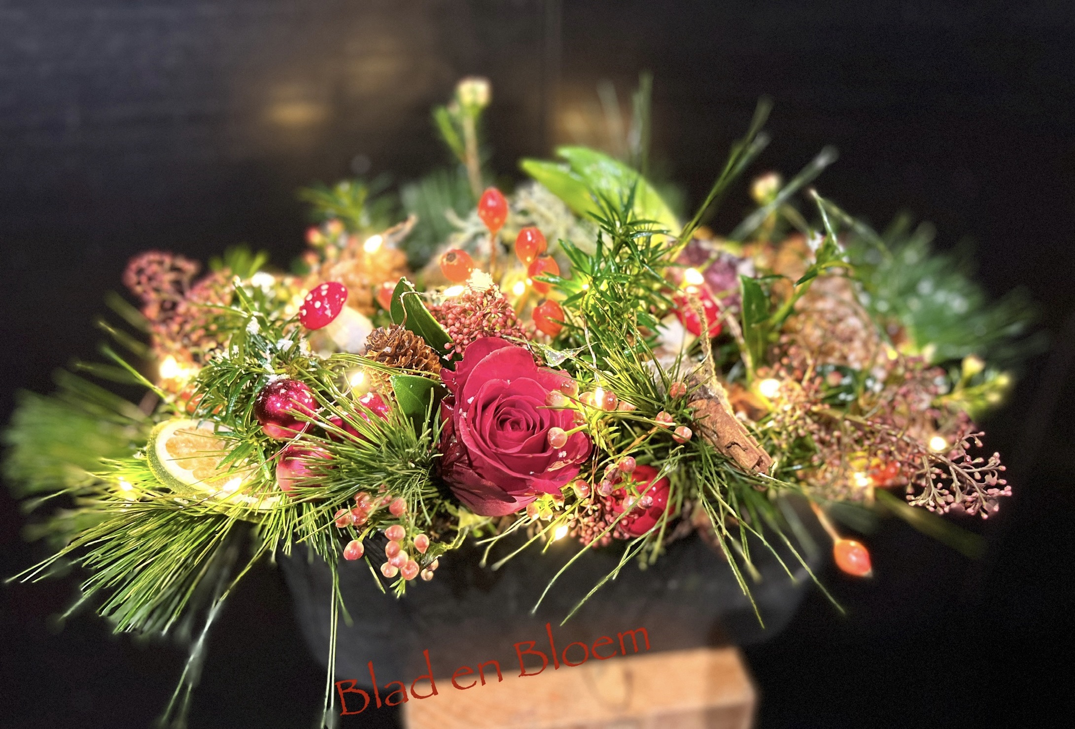 Een mooi kerst bloemstuk gemaakt op een pot, schaal, vaas, plateau (bord), boomstronk, et cetera en/of met verschillende producten en bloemen erin.