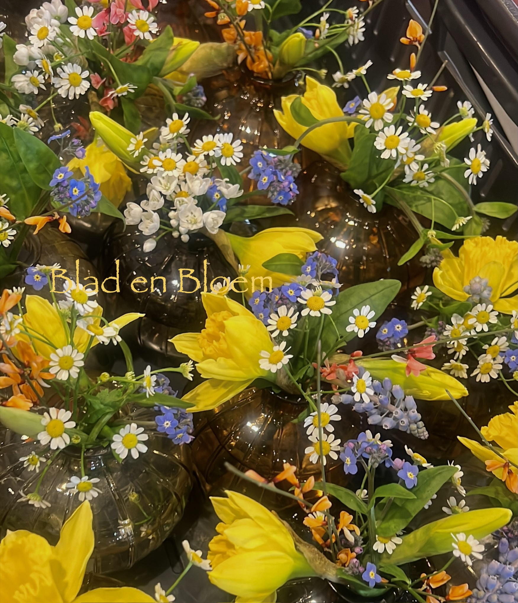 Een pot of glazen vaas met voorjaarsbollen gezellig opgemaakt met o.a. bosbes, schors etc.